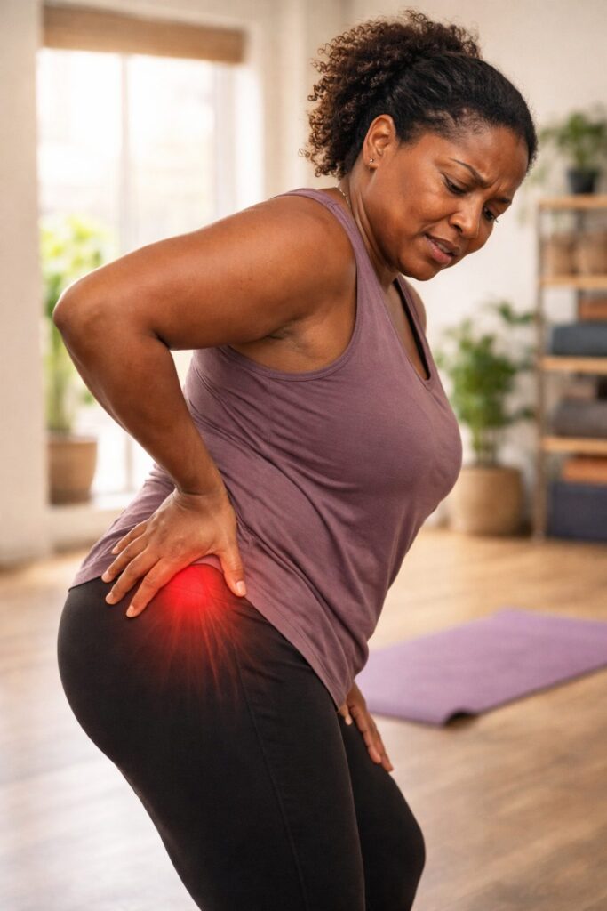 Depuis près d’un an, elle ressent une douleur diffuse à la hanche et à la fesse, parfois accompagnée de raideur lombaire. La douleur apparaît sans déclencheur clair et persiste malgré le repos. Elle a cessé certaines postures et évite maintenant les mouvements d’ouverture par peur d’aggraver la situation.