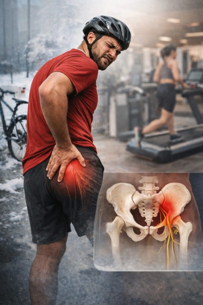 Rapidement, une douleur profonde apparaît sous la fesse, surtout en position assise et lors des montées. Il étire, réduit un peu l’entraînement… mais la douleur persiste et revient dès qu’il augmente l’intensité.